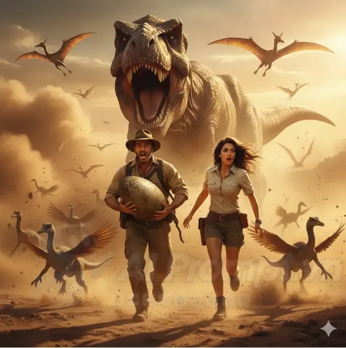 Prompt tập trung vào một cảnh tượng hành động đầy kịch tính, với chủ thể chính là một con T-Rex hùng vĩ đang trỗi dậy từ đám bụi. Song song đó, hai nhân vật con người là một nhà thám hiểm nam và một đồng nghiệp nữ đang chạy trốn khỏi sự truy đuổi. Sự hiện diện của các loài khủng long nhỏ hơn và khủng long bay trên bầu trời cũng góp phần tạo nên một hệ sinh thái phức tạp và hấp dẫn.