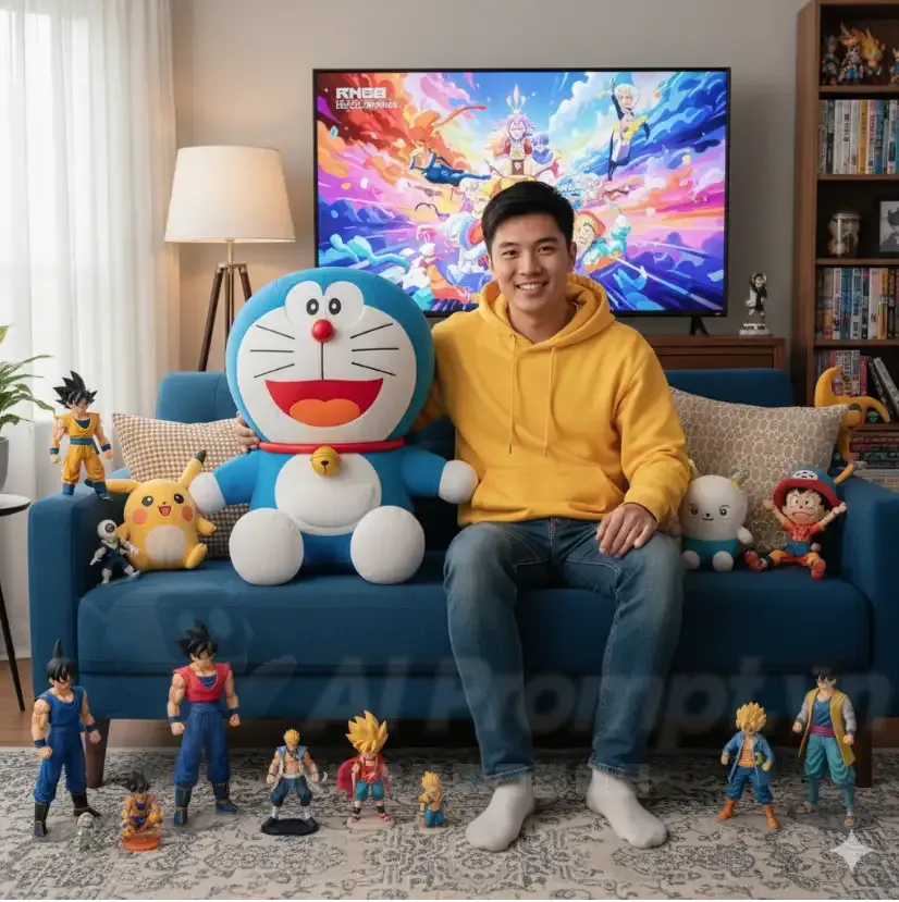 Prompt này mô tả một bức ảnh chân thực, chất lượng cao, tập trung vào một người đàn ông trẻ tuổi châu Á khoảng 20 tuổi. Anh ta ngồi cạnh hai nhân vật hư cấu được thể hiện dưới dạng 3D, sống động. Một nhân vật là Nobita Nobi từ anime Doraemon, được render chân thực và ở một bên khác là một mô hình/thú nhồi bông Doraemon kích thước lớn, cũng được render thực tế.