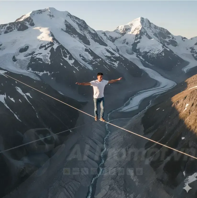 Chủ thể chính là một người đàn ông gốc Á, được miêu tả với sự quyết tâm cao độ. Ông ấy đang thực hiện một màn trình diễn giữ thăng bằng tuyệt vời trên một sợi dây thép căng mỏng. Bối cảnh của hành động này là giữa hai đỉnh núi hùng vĩ, phủ đầy tuyết.