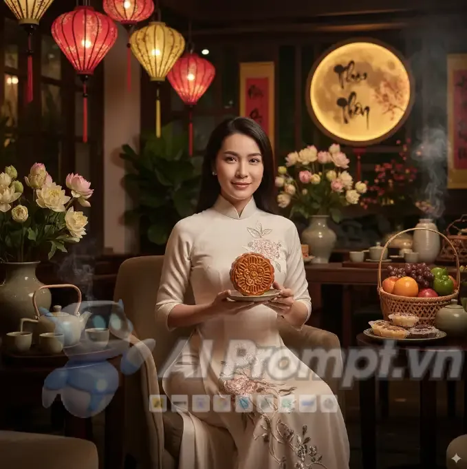 Prompt yêu cầu toàn bộ cơ thể (full-body composition), cho phép hiển thị đầy đủ dáng vóc của người mẫu, không chỉ khuôn mặt. Hành động “holding and appreciating an exquisite mooncake” (cầm và thưởng thức một chiếc bánh trung thu tinh xảo) thể hiện sự chăm chút, trân trọng và một chút sự say mê đối với chiếc bánh. Từ “appreciating” gợi lên một khí chất điềm tĩnh, tinh tế và có chiều sâu.