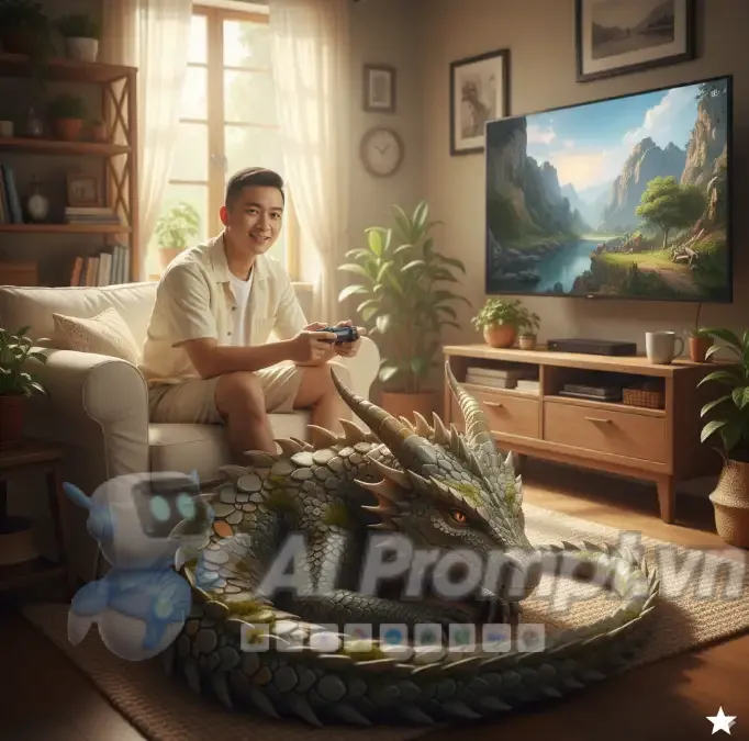 Điểm độc đáo và giả tưởng của prompt nằm ở việc miêu tả “a gentle earth dragon with soft stone scales is curled up like a pet” dưới chân người mẫu. Điều này tạo ra sự tương phản thú vị giữa thế giới thực tế (người mẫu chơi game) và yếu tố kỳ ảo (rồng cưng), đồng thời nhấn mạnh sự “hiền lành” và “mềm mại” của con rồng, gợi ý một hình ảnh thân thiện hơn là đáng sợ.