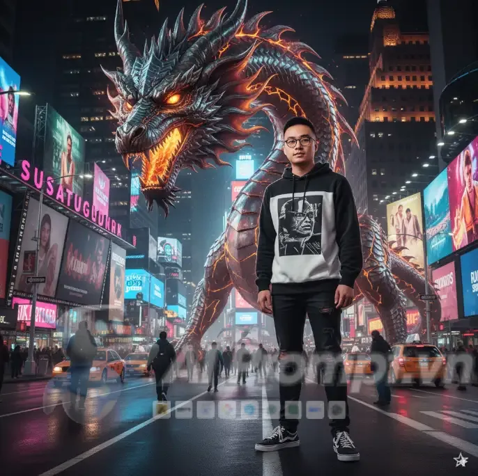 Prompt không đề cập trực tiếp đến trang phục hay phụ kiện của người mẫu. Tuy nhiên, bối cảnh (đường phố New York về đêm, sương mù, rồng băng) và phong cách hình ảnh (photorealistic, cinematic lighting) ngụ ý một phong cách thời trang có thể là hiện đại, đô thị, hoặc thậm chí hơi fantasy để phù hợp với sự tương phản giữa con người và sinh vật huyền bí. “Nhìn thẳng vào camera” tạo ra sự kết nối trực diện với người xem.