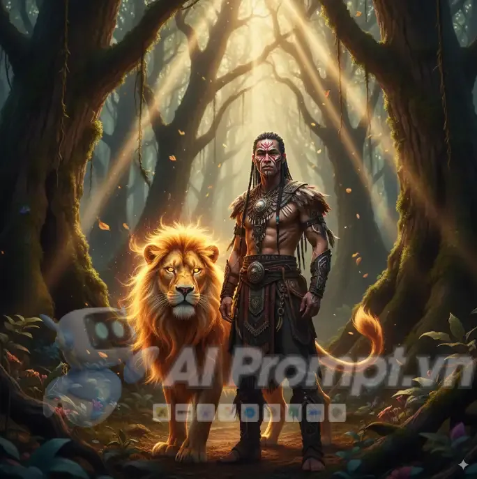 Prompt này tập trung vào hai chủ thể chính: một người mẫu nam người Á Đông và một sinh vật thần thoại được mô tả là “sư tử mặt trời”. Người mẫu nam được yêu cầu có diện mạo chân thực và trang phục bộ lạc cổ xưa. Sư tử mặt trời phải có bộ lông màu vàng cam rực rỡ, gợi lên hình ảnh của ánh nắng mặt trời. Sự kết hợp giữa con người và sinh vật thần thoại này tạo nên một yếu tố giả tưởng mạnh mẽ cho hình ảnh.