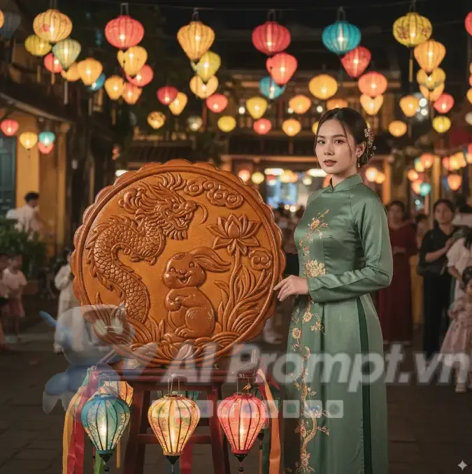 Prompt không trực tiếp đề cập đến trang phục hay trang sức, nhưng bối cảnh “Việt Nam trong Lễ hội Trung Thu” (Vietnam during the Mid-Autumn Festival) ngụ ý rằng trang phục có thể liên quan đến áo dài truyền thống hoặc trang phục hiện đại mang đậm nét văn hóa Việt Nam. Sự tỉ mỉ trong việc khắc bánh Trung Thu cũng có thể gợi ý một không khí trang trọng, tinh tế cho toàn bộ bức ảnh. Tuy nhiên, đây là một điểm có thể được khai thác thêm trong prompt.