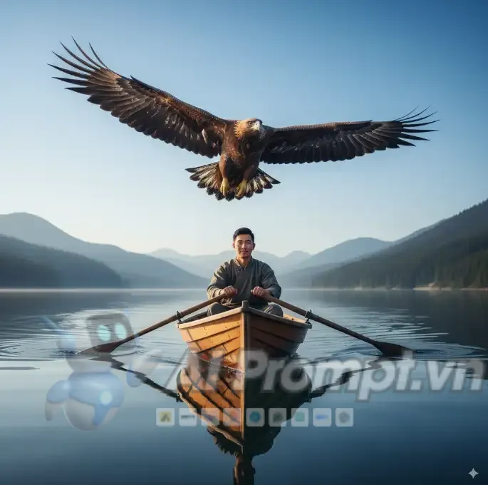 Đây là một prompt được xây dựng khá chi tiết, kết hợp giữa chủ thể rõ ràng (người mẫu châu Á), hành động cụ thể (điều khiển thuyền), bối cảnh thiên nhiên hùng vĩ (hồ phẳng lặng, đại bàng bay trên trời xanh) và yêu cầu kỹ thuật cao (siêu thực, ánh sáng tự nhiên). Các chỉ thị tiêu cực được sử dụng hiệu quả để tránh các lỗi phổ biến trong AI tạo ảnh, hứa hẹn một kết quả hình ảnh chất lượng cao, có chiều sâu và thẩm mỹ tốt. Sự kết hợp giữa con người và biểu tượng thiên nhiên tạo nên một chủ đề đầy ý nghĩa.