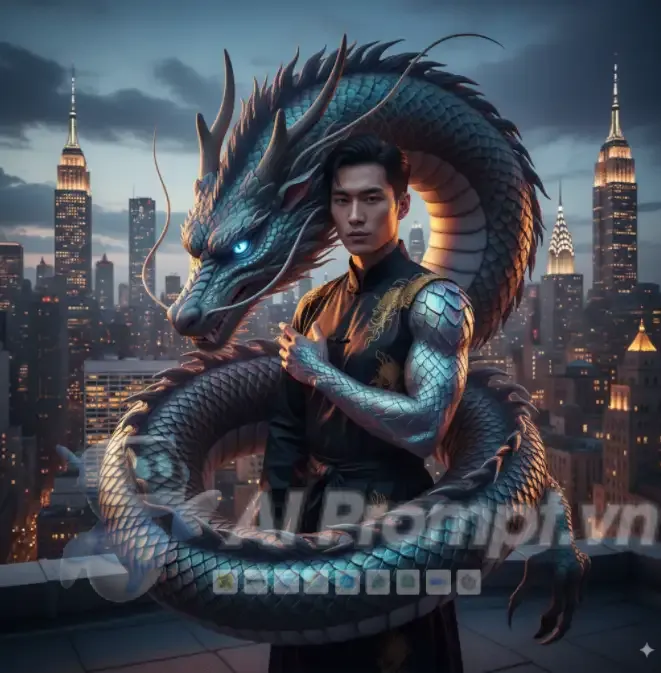 Prompt này yêu cầu một hình ảnh chân thực, kết hợp yếu tố con người (người mẫu nam châu Á) với yếu tố giả tưởng (rồng thiêng có vảy phát sáng) trong một khung cảnh đô thị quen thuộc (New York City). Sự nhấn mạnh vào ánh sáng điện ảnh, bố cục ảnh rộng và việc tránh các lỗi kỹ thuật như nhòe hay biến dạng sẽ tạo nên một tác phẩm nghệ thuật độc đáo, thể hiện sự tương tác mạnh mẽ giữa con người và thế giới siêu nhiên.