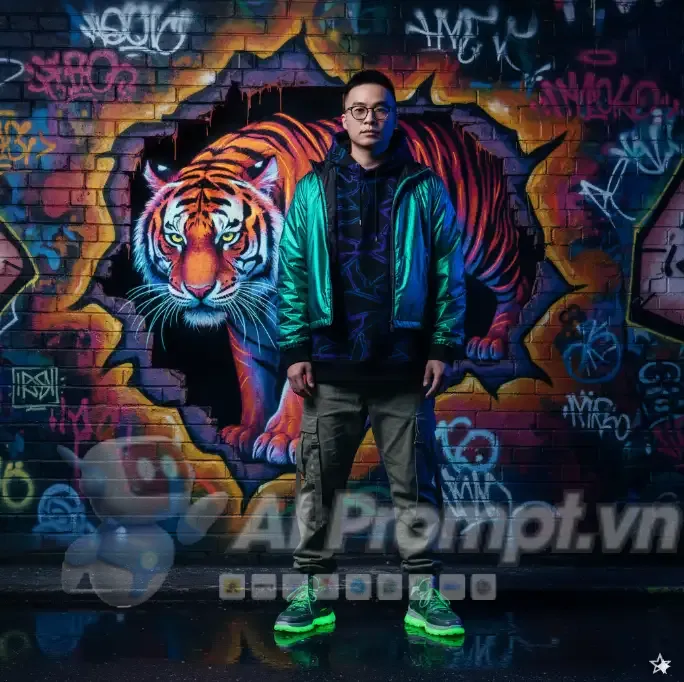 Chủ thể chính của bức ảnh là một người mẫu nam Châu Á, được mô tả là sành điệu. Yêu cầu “(100% same face as reference)” là một chỉ dẫn quan trọng cho mô hình AI, yêu cầu sự tương đồng khuôn mặt tối đa với một hình ảnh tham chiếu được cung cấp (mặc dù hình ảnh tham chiếu không có trong prompt này). Điều này ám chỉ một mong muốn kiểm soát chặt chẽ đặc điểm nhận dạng của chủ thể. Ngoài ra, một con hổ với bộ lông phát sáng neon bất ngờ xuất hiện từ bức tường graffiti.