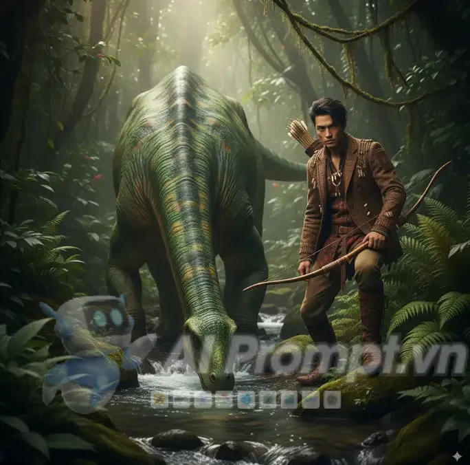Nhân vật được miêu tả như một “thợ săn huyền thoại”, ám chỉ một tư thế mạnh mẽ, cảnh giác và có kinh nghiệm. Việc “nhìn thẳng vào máy ảnh” tạo ra một kết nối trực tiếp với người xem, thể hiện sự tự tin và có thể pha lẫn sự thách thức hoặc nhận thức về sự quan sát. Khủng long “ăn cỏ hiền lành” đang uống nước ở con suối làm nền, tạo ra sự tương phản thú vị giữa người thợ săn và con mồi tiềm năng, đồng thời mang đến cảm giác yên bình cho cảnh vật.