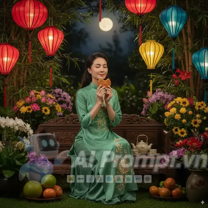 Prompt không đề cập chi tiết đến trang phục hay trang sức, tuy nhiên, bối cảnh và hành động (thưởng thức bánh Trung Thu) gợi ý một phong cách trang trọng, truyền thống và phù hợp với không khí Lễ hội Trung Thu tại Việt Nam. Mô hình có thể sẽ suy luận về trang phục lịch sự hoặc có yếu tố văn hóa Á Đông phù hợp với hoàn cảnh.