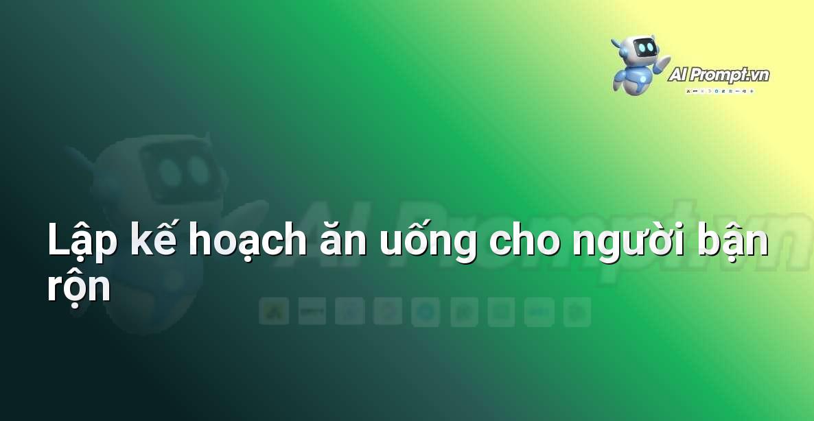 “Tôi có lịch trình làm việc rất bận rộn và ít thời gian để chuẩn bị bữa ăn. Mục tiêu của tôi là **tăng cường năng lượng và sức khỏe tổng thể**. Tôi cần các bữa ăn nhanh chóng, tiện lợi nhưng vẫn đầy đủ dinh dưỡng. Vui lòng đề xuất các ý tưởng bữa ăn, công thức nấu ăn đơn giản ‘chuẩn bị trước’ (meal prep), hoặc các lựa chọn thay thế thông minh cho bữa sáng, trưa, tối và bữa phụ.”