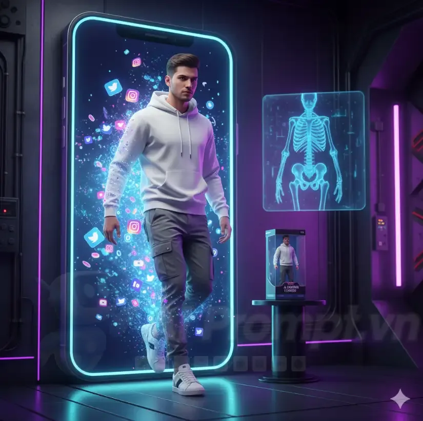 Prompt tập trung vào một chủ thể chính là một thanh niên. Điểm nhấn là sự biến đổi của anh ta, chuyển từ dạng các hạt kỹ thuật số và biểu tượng mạng xã hội phát sáng sang hình dạng con người hoàn toàn thực tế. Sự chuyển đổi này là yếu tố cốt lõi, thể hiện sự hòa quyện giữa thế giới số và con người.